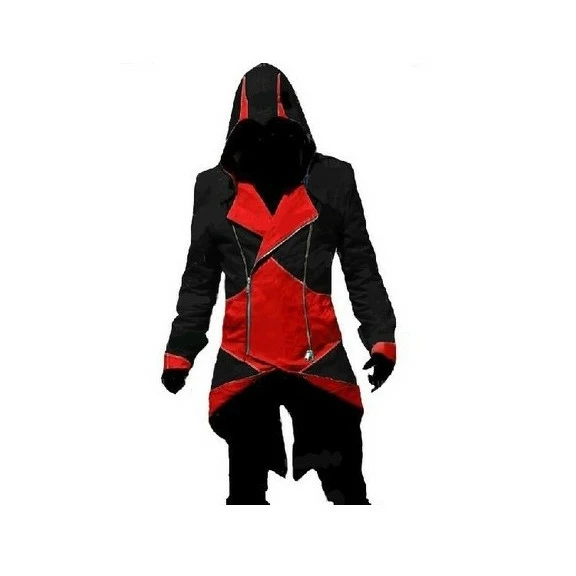 The Assassin’s Creed Hooded Robe Jacket has a detachable black hood with red stripes and a lapel style collar with asymmetrical zip closure makes this Assassins Creed Jacket one of its kind. It features a cutaway style waist with a central vent in a conical shape. Two diagonal pockets at the waist, button-studded cuffs style with black appliqué detail and a broad red color waistband. This Assassin’s Creed Hooded Robe Jacket is extremely comfortable to wear, which is an iconic piece for cosplay.
