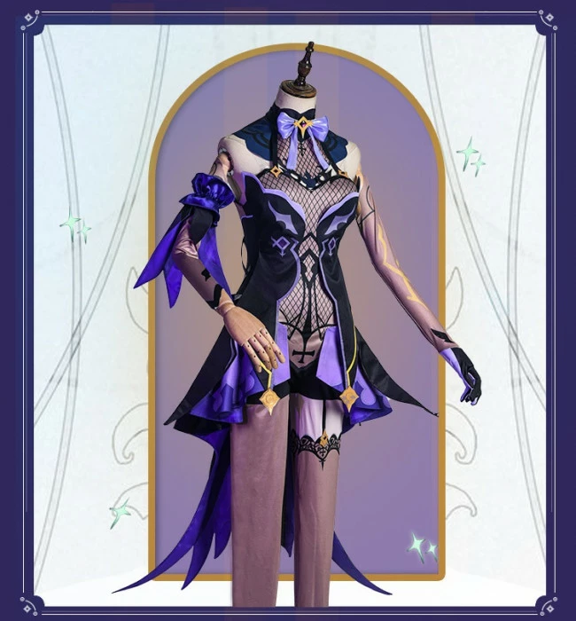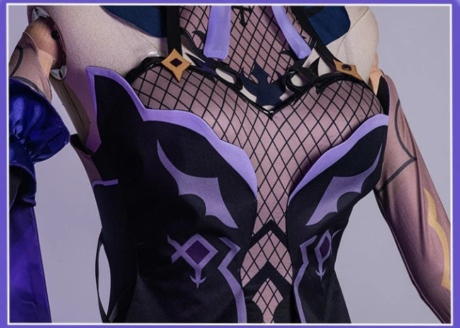 Genshin Impact Fischl Cosplay Costume. Genshin Impact is an open world all action role-playing game. In the game, the players control a number of party members, that have different abilities, gear, weapons and personalities. You can switch between characters during fights in order to use a different mix of skills and attacks. The reason Genshin Impact is so popular is because it is a F2P game. Fischl is a playable Electro character. She is a brave adventurer with over the top theories that end up being true. Fischl is crazy about fantasy stories and roleplays. When she is not roleplaying, she is a kind and well beahved girl. Fischl is close to her parents and her parents respects her decision. She is also a great investigator. Fischl has blonde color hair, light green eyes and a small build fair girl. Here we have Fischl’s costume that is a sleveless black lace dress. Beautifully designed, excellent workmanship, lightweight, fashionable and creative, this is a must have costume for all kinds of occasions, events and parties.