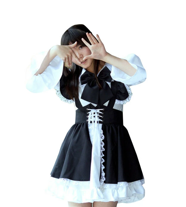 – French Maid costume featuring a black mini dress with long sleeves, lace-up waist cincher with lace trim
