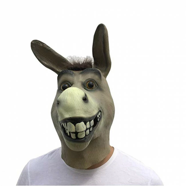 The Shrek Donkey Mask is made of vinyl and has long protruding ears. The default Shrek mask has holes in the eyes, nose and mouth. At the head of the licensed Shrek Donkey Mask contains hair. The Shrek Latex Mask ebenfallls is an original licensed mask from the movie.